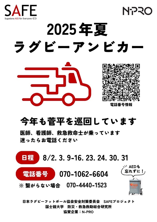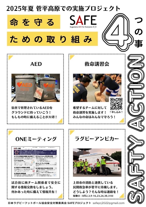 SAFE(Sugadaira AED for Everyone)プロジェクトとは、日本ラグビーフットボール協会安全対策委員会の支援の下2022年度より運営されているAEDの普及、菅平を安全な環境にする事を目指したプロジェクトです。